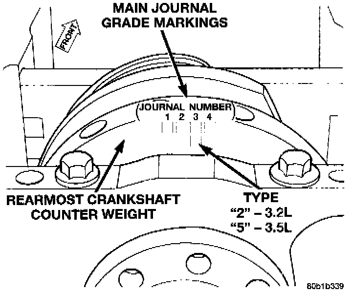 The main bearings are a "select fit" to achieve proper oil clearances. For main bearing selection, the block and crankshaft have grade identification marks.