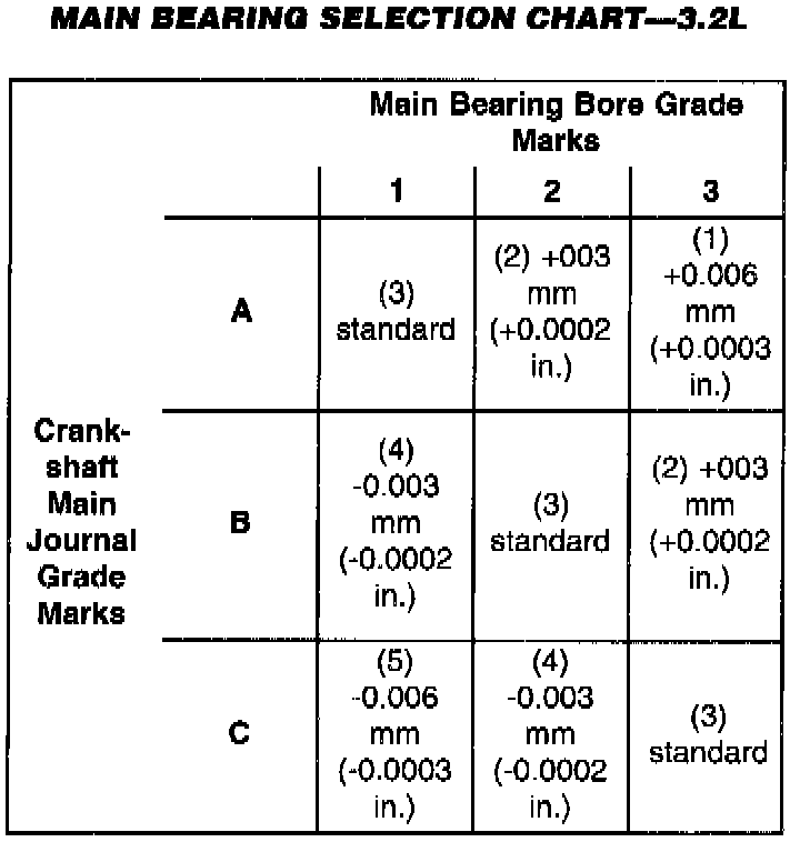 Use the Main Bearing Selection Chart to properly select the main bearings. For an example, if the main bore grade is 3 and the journal grade is B. the proper select fit bearing would be a (2) +0.003 mm (+0.0002 inch).
