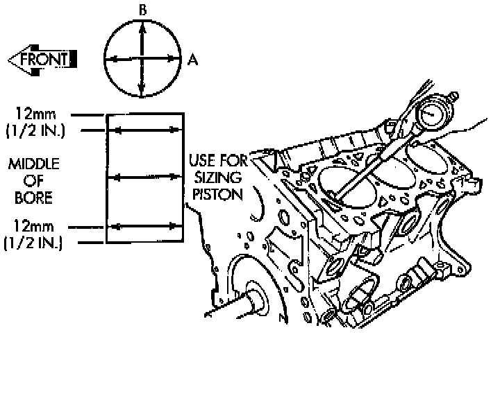 Measure the cylinder bore at three levels in directions A and B. Top measurement should be 12 mm (0.50 inch) down and bottom measurement should be 12 mm (0.50 inch) up from bottom of bore. Refer to Cylinder Bore and Piston Specification Chart.