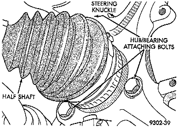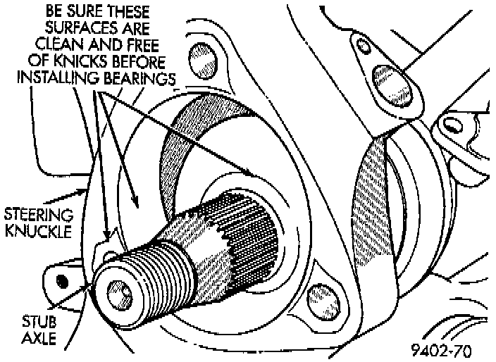 - Hub and bearing assembly mounting surfaces on steering knuckle and halfshaft must be smooth and completely free of foreign material or nicks.