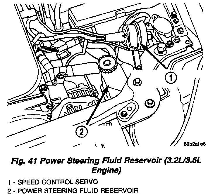 NOTE: The power steering pump fluid reservoir on this vehicle is remotely mounted from the power steering pump. The reservoir is located on the left front frame rail.