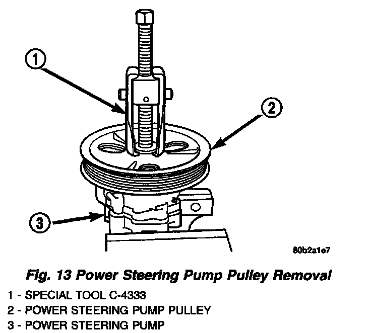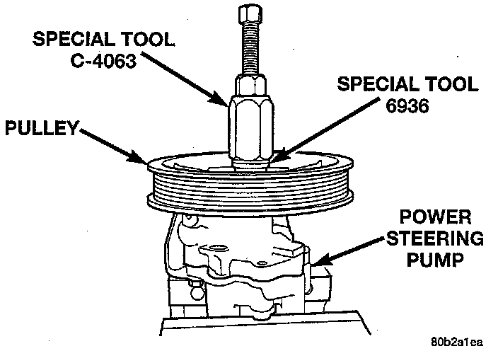 2. Remove the power steering pump pulley from the power steering pump shaft using Puller, Special Tool C-4333, or equivalent.