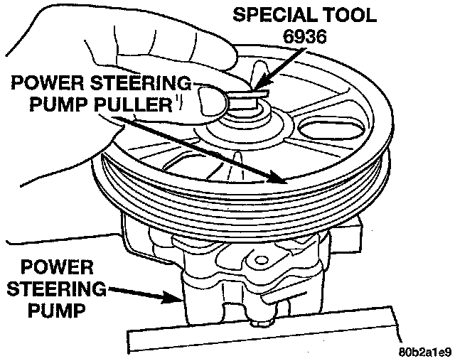 NOTE: Do not press or hammer on the shaft of the power steering pump in an attempt to remove the pulley. This will damage the internal components of the power steering pump.
