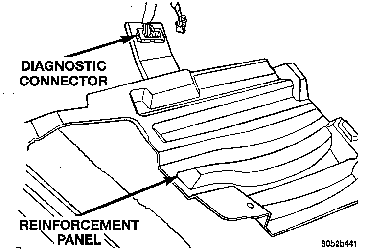 7. Remove the 4 bolts mounting the reinforcement to the instrument panel. Remove the reinforcement from the instrument panel. Remove the diagnostic connector from the reinforcement.
