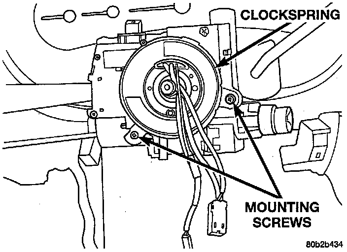 22. Remove the 2 screws mounting the clockspring to the steering column. Remove the clockspring from the steering column.