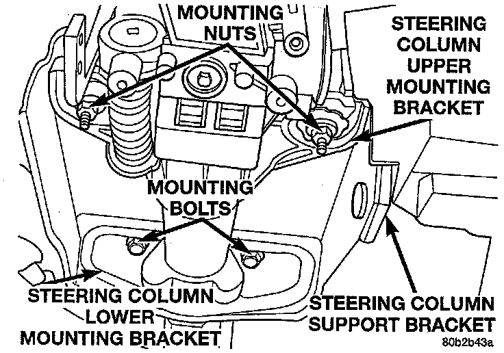 30. Remove the 2 steering column upper mounting bracket to support bracket nuts. Then loosen the 2 bolts attaching the steering column lower mounting bracket to support bracket.