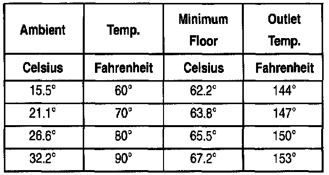 Engine coolant is provided to the heater system by two 16 mm (5/8 inch inside diameter) heater hoses. With engine idling at normal running temperature, set the control to maximum heat, floor, and high blower setting. Using a test thermometer, check the air temperature coming from the floor outlets, refer to Temperature Reference Table.