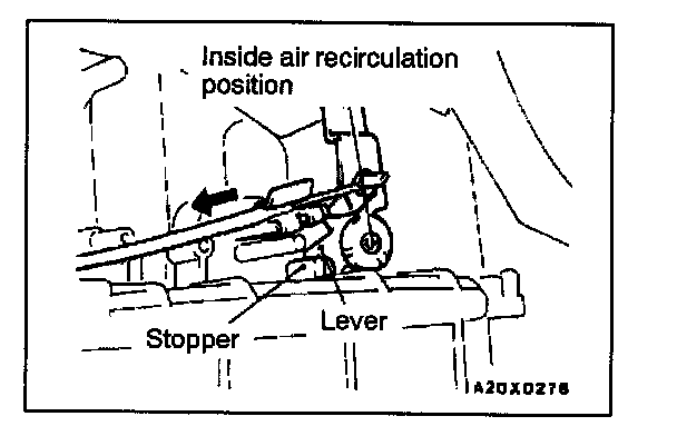(9) Set the inside/outside air changeover damper lever of the blower unit to inside air recirculation position (while the inside/outside air changeover damper lever touches the stopper of the blower case) and install the cable to the lever pin.