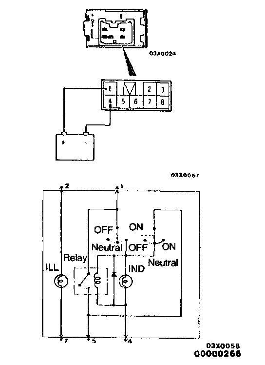 2. When the battery (+) side is connected to terminal 1 and the (-) side is connected to terminal 4, and the main switch is turned to ON, check if battery voltage is output between terminal 5 and the ground until the main switch is turned to OFF.