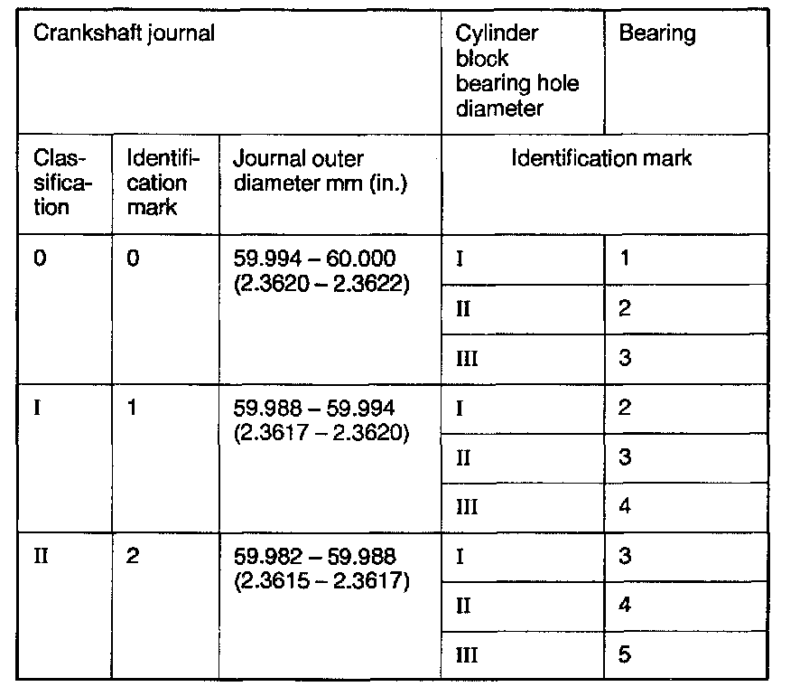 1. If the crankshaft and journal outer diameter is 60.000 mm (2.3622 inch), the classification will be "0" and the identification mark will be "U".
