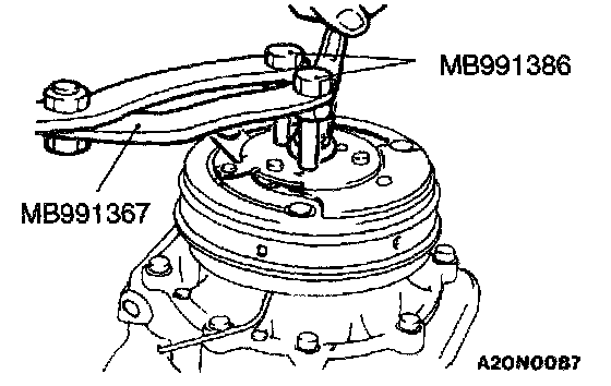 Use the special tool to hold the magnet clutch, and tighten the nut in the same manner as removal.