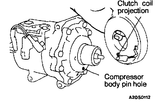 When installing the clutch coil to the A/C compressor body, install so that the pin hole of the A/C compressor body and the clutch coil projection are aligned.