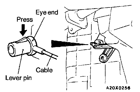 1. Press the lever pin to disconnect the air outlet change-over damper cable.