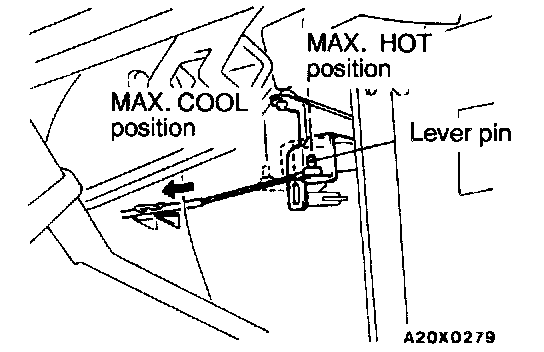 3. Set the air mix damper lever at the upper part of the heater unit to the MAX. HOT position, and install the cable to the lever pin.