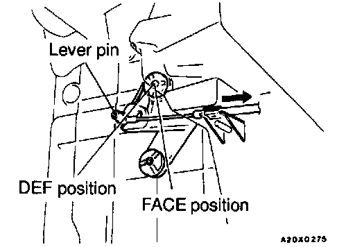 6 Set the air outlet change-over damper lever of the heater unit to DEF position and install the cable to the lever pin.