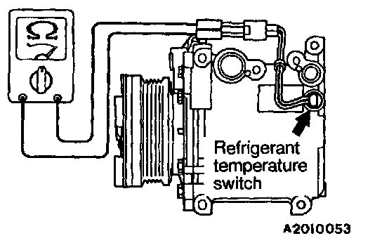 When the A/C is off, check that there is continuity between the refrigerant temperature switch terminals. If no, replace the refrigerant temperature switch.
