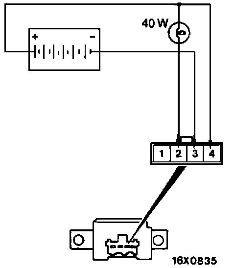 1. Connect the battery and the test light (40 W) as shown in the illustration.