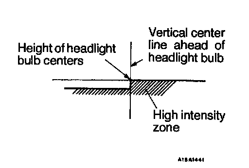 1. A properly aimed lower beam will appear on the aiming screen 3 m (9.8 feet) in front of the vehicle. The shaded area as shown in the illustration indicates high intensity zone.