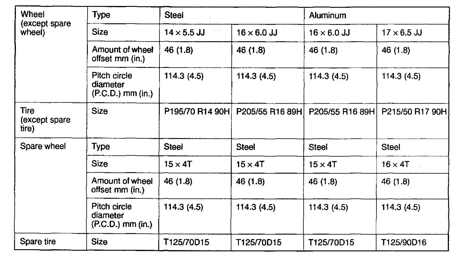 Both steel type and aluminum type wheels have been adopted. The type of wheel used depends on the vehicle model. A compact spare tire has been adopted as the spare tire in all models.