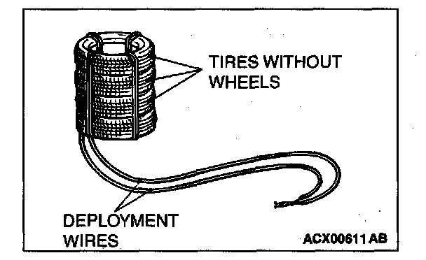 3. Place three old tires, without wheels, on top of the tire secured to the air bag module, and secure all tires together with ropes (4 locations).