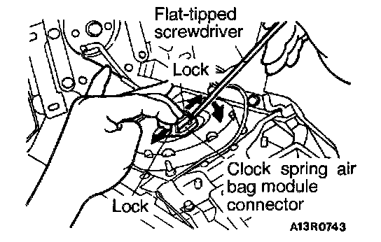 2. When disconnecting the connector of the clock spring from the air bag module, press the air bag's lock toward the outer side to spread it open. Use a screwdriver, as shown in the image, so as to remove the connector.