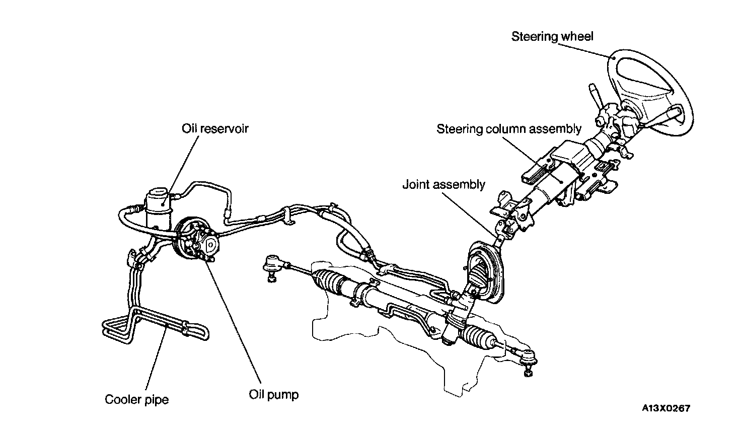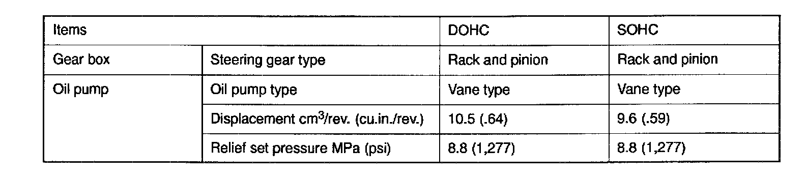 The type of power steering which is responsive to engine speed has been adopted in all models. The main features are as follows. Four-spoke steering wheel has been adopted. In addition, (SRS) Supplemental Restraint System is provided as a standard in all vehicles.The steering column in all vehicles has a shoe absorber mechanism and a tilt steering mechanism. A vane-type oil pump with a fluid flow control system included has been adopted. The steering gear and linkage is an integral rack and pinion type.