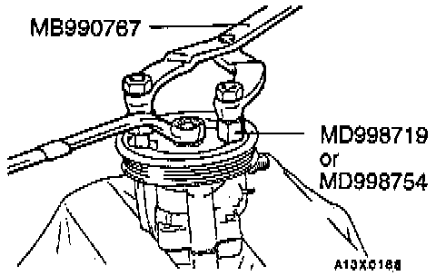 Use the special tool to secure the pulley, and then remove the pulley mounting nuts.