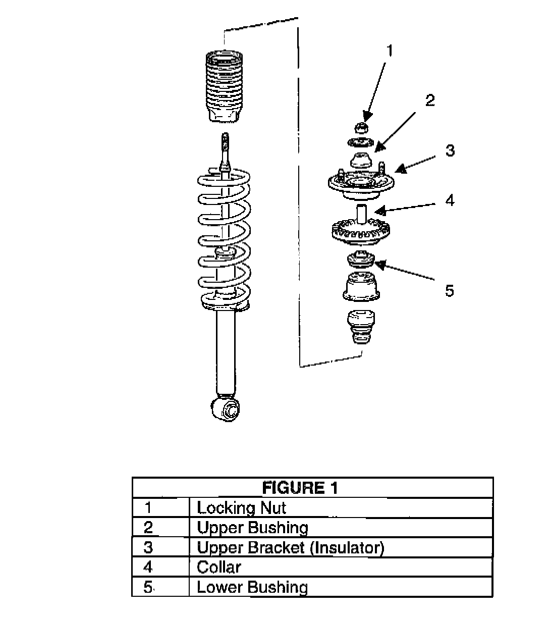 This bulletin involves replacing the rear shock bracket assembly (insulator), upper & lower insulator bushing, and the bushing collar with newly designed parts.
