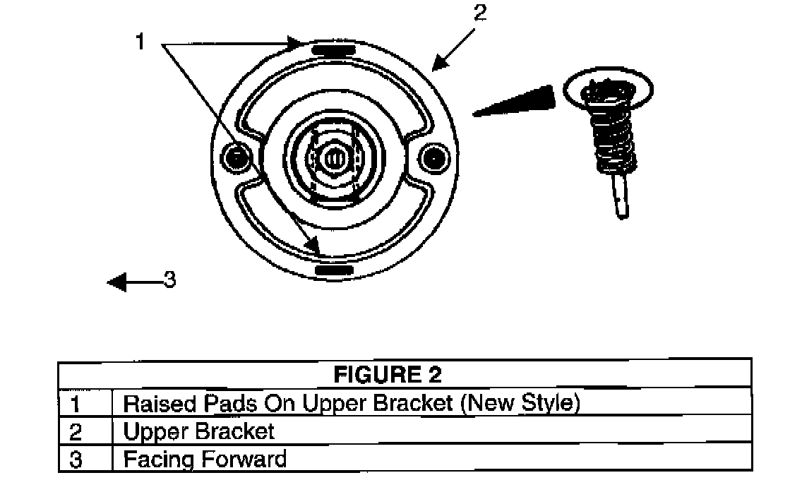 VEHICLES BUILT BETWEEN 1/27/98 AND 7/31/98 (MDH O127XX AND 0731XX) MAY HAVE THE NEW BRACKET INSTALLED. IF TSB 02-07-98 HAS BEEN PERFORMED, THE NEW BRACKET SHOULD HAVE BEEN INSTALLED. INSPECT THE BRACKET AS SHOWN IN FIGURE 2. IF THE REMOVED BRACKET HAS RAISED PADS AS SHOWN, IT WILL NOT HAVE TO BE REPLACED.