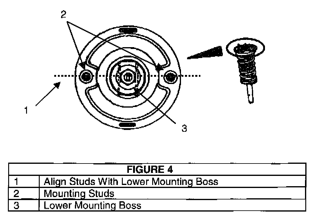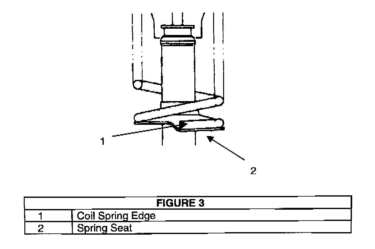 6. Reassemble the rear strut assembly by compressing the coil spring and installing it onto the shock absorber. Make sure the lower edge of the coil spring fits into the spring seat properly (Figure 3) and the upper bracket mounting studs are in line with the lower shock mounting boss hole (Figure 4).