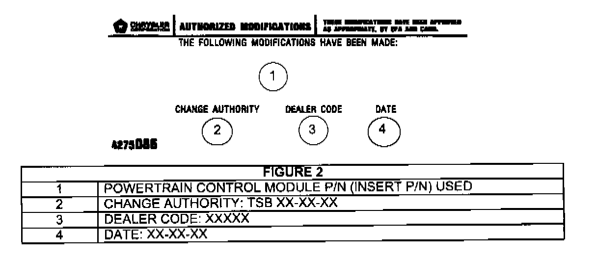 9. Type the necessary information on the "Authorized Software Update Label" p/n 04669020 (Figure 1). Attach the label to the PCM and cover the label with the clear plastic overlay.