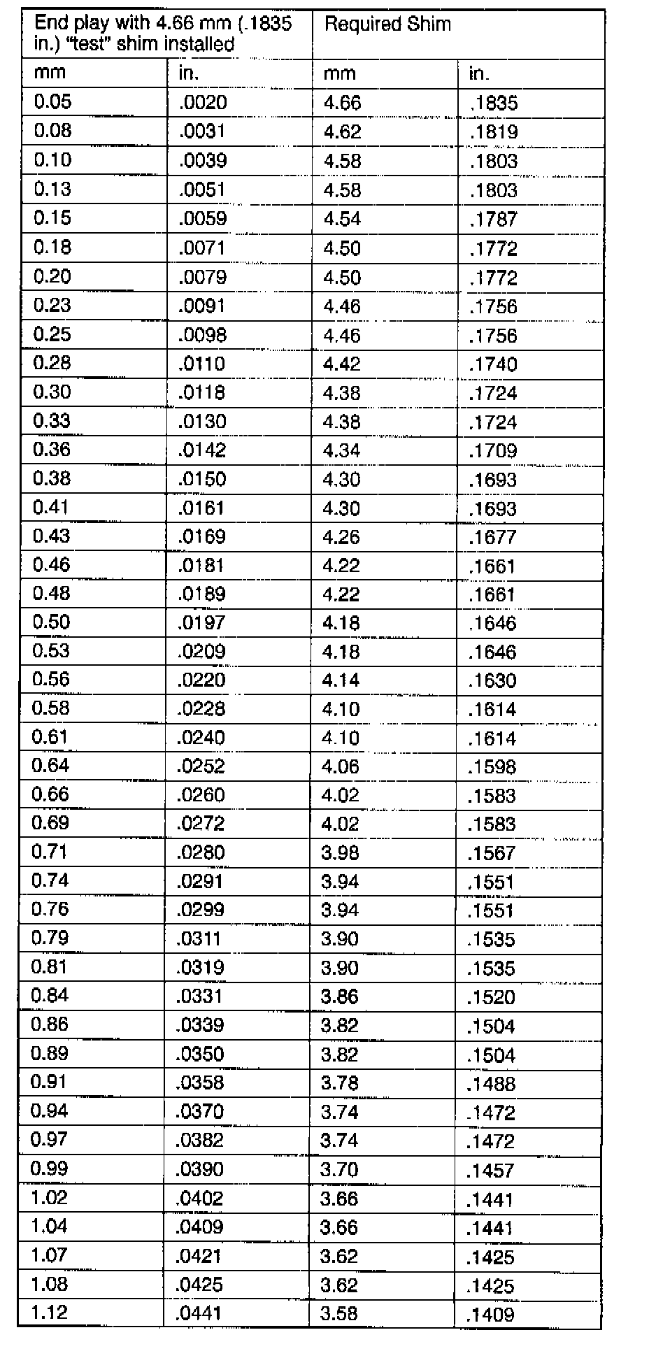 For example if end play reading is 1.40 mm (0.0551 inch), subtract end play specifications. 1.40 mm (0.0551 inch) - [0.13 mm (0.0051 inch) to 0.64 mm (0.0252 inch) ] = 1.27 mm to 0.76 mm (0.0500 inch to 0.0299 inch). Add "test" shim. 0.76 mm to 1.27 mm (0.0299 inch to 0.0500 inch) + 0.81 mm (0.0319 inch) = 1.75 mm to 2.08 mm (0.0618 inch to 0.0819 inch). Select shim closest to mid point or 1.69 mm to 1.91 mm (0.0665 inch to 0.0752 inch).