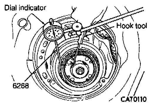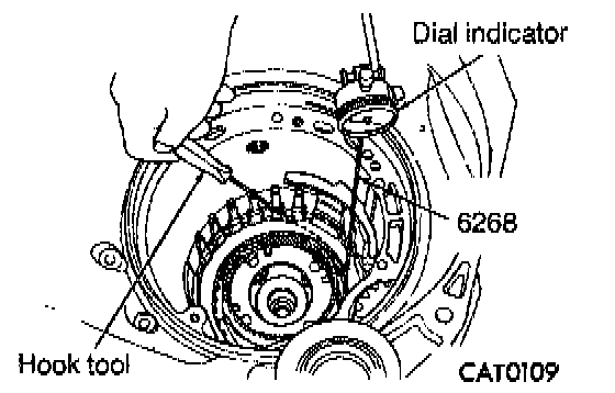 71. Check clutch clearance. Set up Dial Indicator set using Dial Indicator Tip 6268 as shown. Press down on the clutch pack with finger and zero dial indicator. Raise one clutch disc with a hook tool. Read the dial indicator.