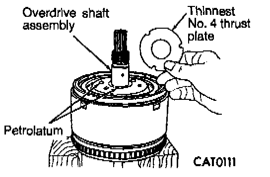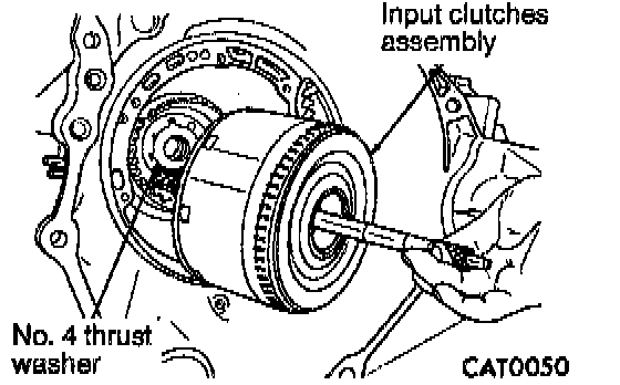 76. To determine the proper thickness of the No. 4 thrust plate, select the thinnest No. 4 "test" thrust plate. Using petrolatum to hold thrust plate in position, install input clutches assembly. Be sure the input clutches assembly is completely seated.