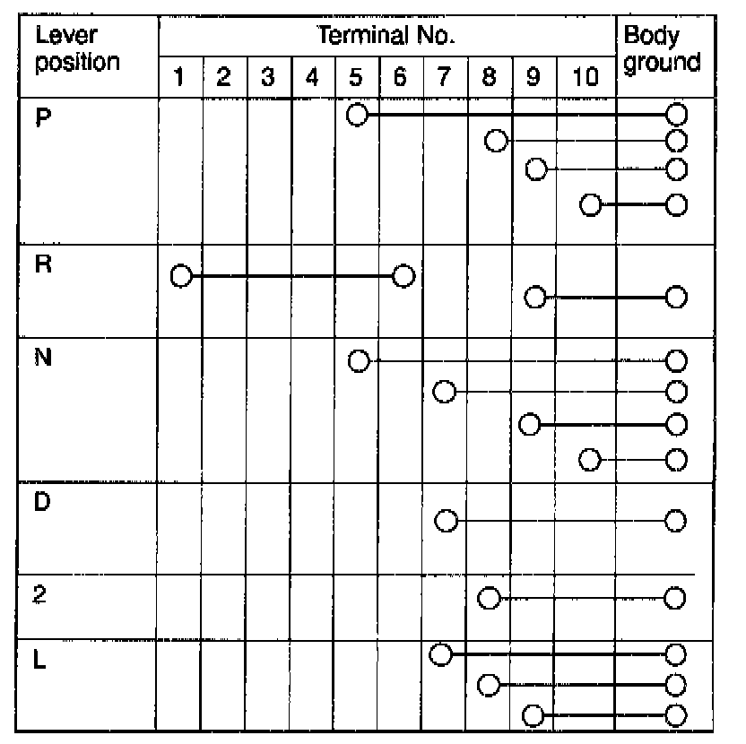 1. Disconnect the transaxle range sensor connector.2. Check the continuity between sensor terminals and body ground (and terminals 1 - 6) while shifting the gearshift lever at each position. The continuity between sensor terminals and body ground (and terminals 1 - 6) should be as shown in the table below.