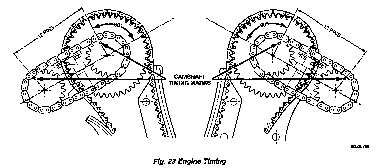 4. Count chain pins from the mark on the intake camshaft towards the exhaust camshaft. Engine is timed correctly when there are 12 chain pins between the timing marks on the intake camshaft and exhaust camshaft.