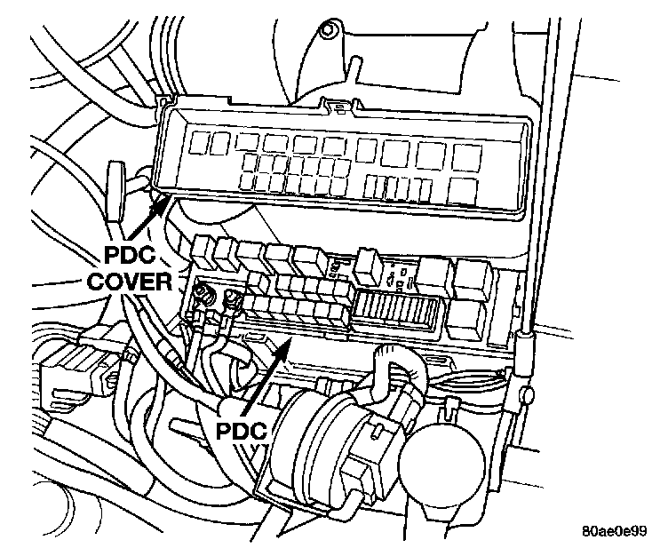 The ASD relay and fuel pump relay are located in the Power Distribution Center (PDC) near the battery. A decal on the inside of the PDC covers shows the locations of each relay and fuse contained in the PDC.