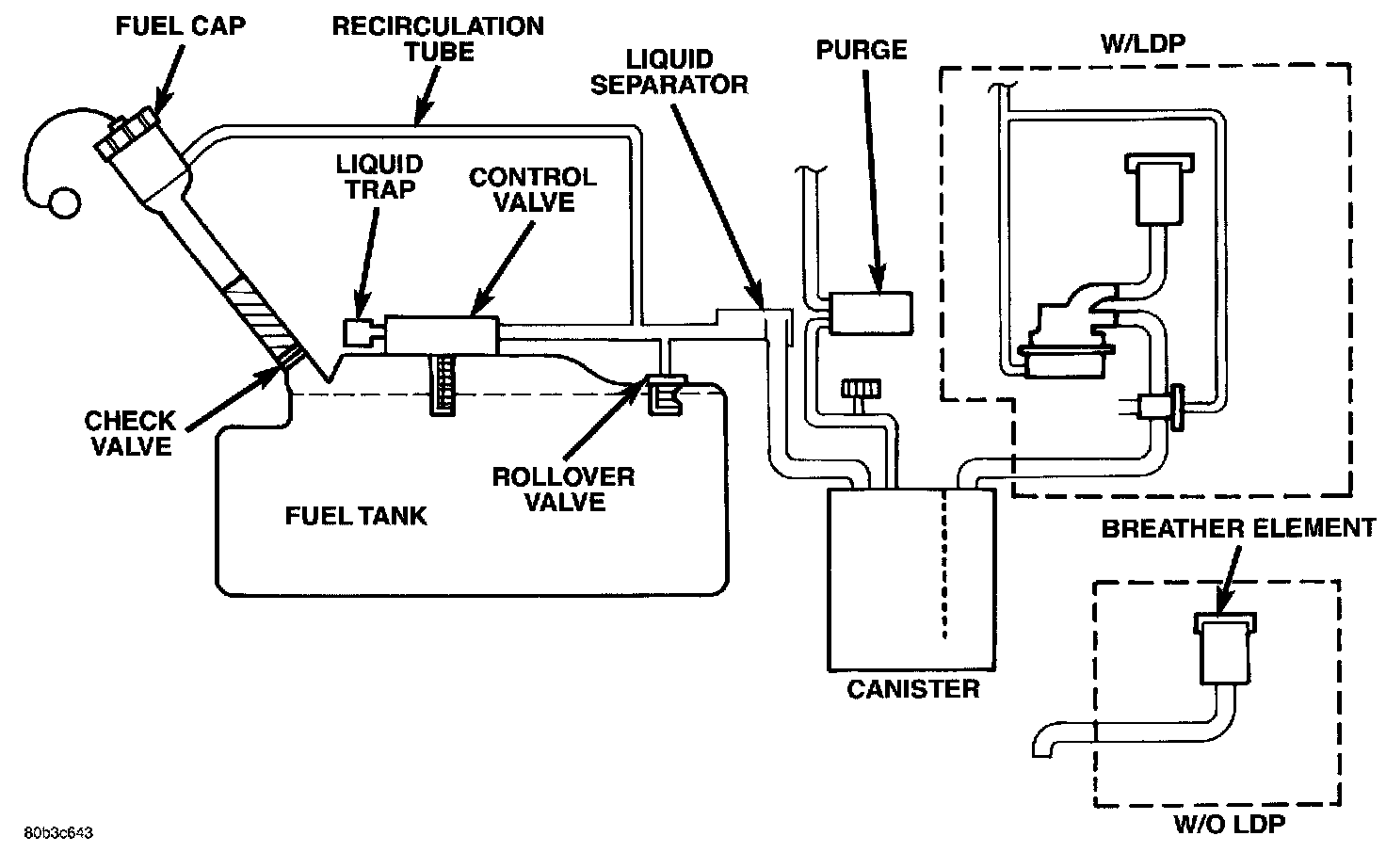 The check valves are one-way valves. The first check valve is used to draw outside air into the lower chamber of the LDP (the space that is below the pump diaphragm). The second check valve is used to vent this outside air, which has become pressurized from the fall of the pump diaphragm, into the evaporative system.