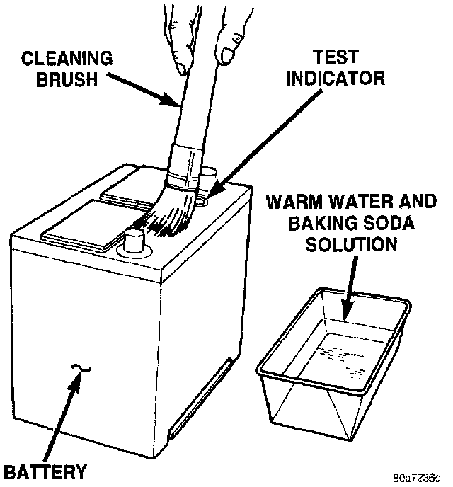 CAUTION: Do not allow baking soda solution to enter vent holes, as damage to battery can result.1. Clean top of battery with a solution of warm water and baking soda.