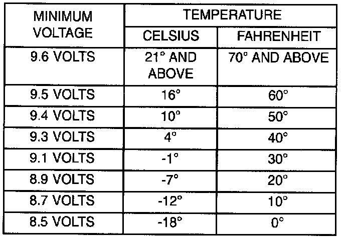 5. Voltage drop will vary according to battery temperature at the time of the load test. Battery temperature can be estimated by the temperature of exposure over the preceding several hours. if the battery has been charged or boosted a few minutes prior to the test, the battery would be slightly warmer. Refer to Load Test Temperature Chart for proper loaded voltage reading.