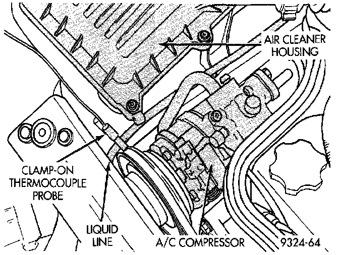 2 Attach a clamp-on thermocouple (P.S.E. 66-324-0014 or 80PK-1A) or equivalent to the liquid line. It must be placed as close to the condenser outlet as possible to observe liquid line tubing temperature. Refer to "Thermocouple Probe" for more information on probe.