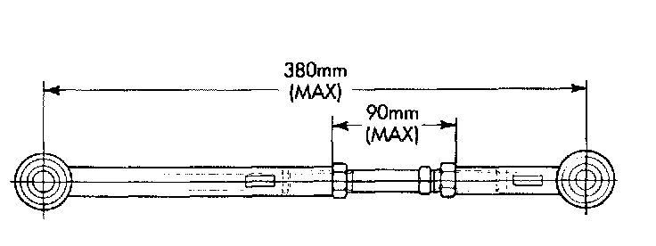 CAUTION: When setting rear toe-in on vehicle, the maximum lengths of the adjustable lateral link at the locations shown must not be exceeded. If these maximum lengths are exceeded, inadequate retention of adjustment link to the inner and outer link may result. Ensure that the adjustment sleeve jam nuts are torqued to the required specifications when the Toe setting procedure is completed.
