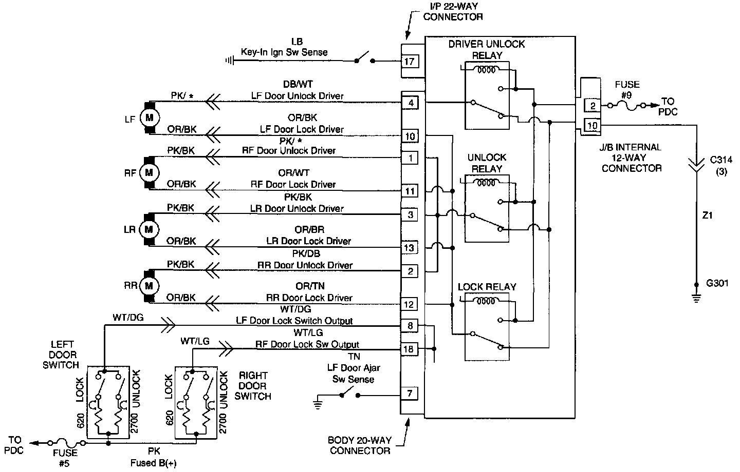 When trouble shooting problems with the Remote Keyless Entry System, always verify that the power door lock/unlock switches are functional. If the doors do not lock/unlock with the power switches, the following modules should be analyzed: Lock/Unlock Switches, Body Control Module, and the door lock/ unlock latches. FUSE TEST