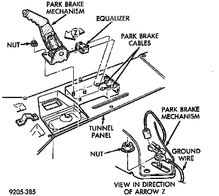 1. Install park brake mechanism over mounting studs in tunnel panel. Install the 3 mounting nuts attaching park brake mechanism to tunnel panel. Install the ground wire between rear park brake mechanism and the mounting nut. Tighten the 3 park brake mechanism mounting nuts to a torque of 29 Nm (250 inch lbs.).