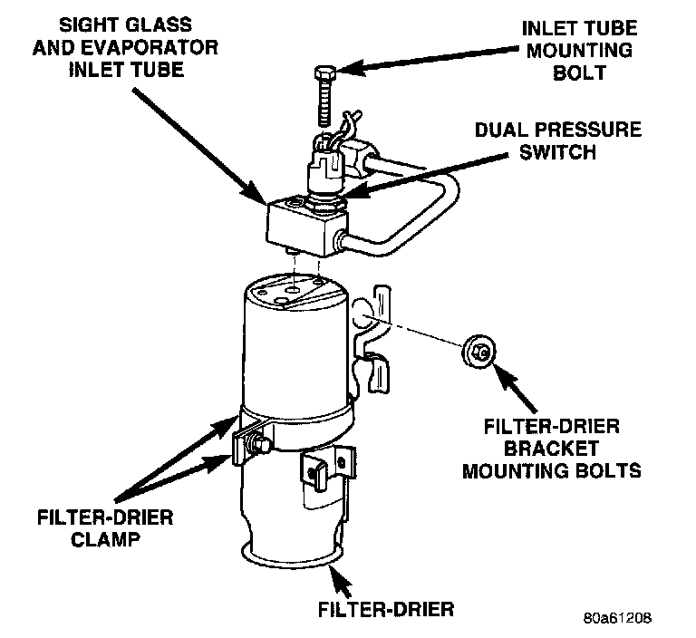 2. Reverse the above procedures. Tighten Filter Drier Attaching Nuts to 5 - 6 Nm (40 - 50 in. lbs.) torque.