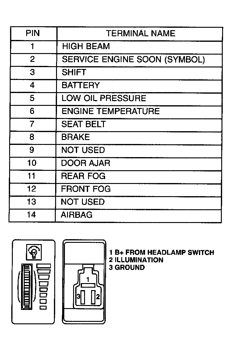 c. Connect panel dimmer switch to the wire harness connector. Turn the headlamp switch to the ON position. Test cavity 2 at the wire side of the connector for voltage, turn knob and check for a voltage change. If not OK, replace panel dimmer switch. If OK, check circuit and repair as necessary.