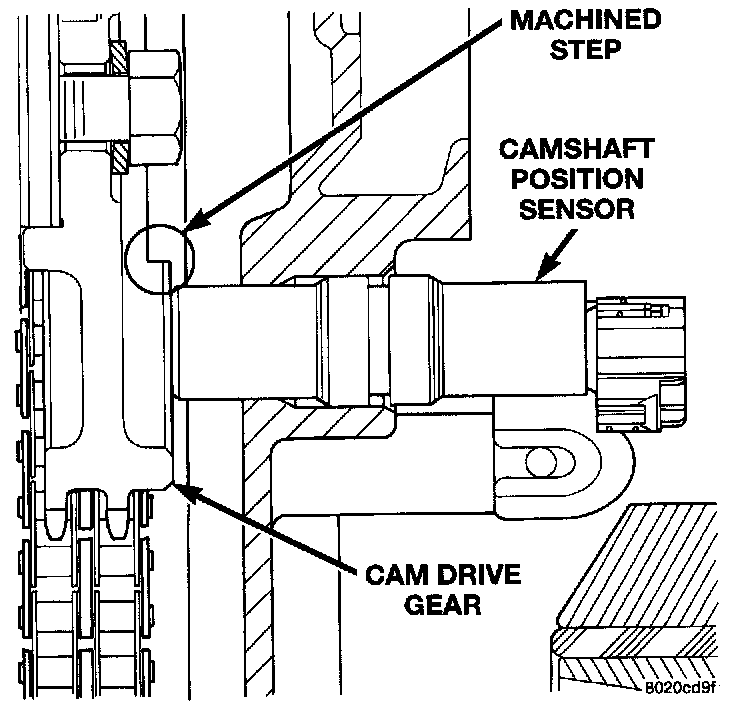 A low and high area are machined into the camshaft drive gear. The sensor is positioned in the timing gear cover so that a small air gap exists between the face of sensor and the high machined area of cam gear.