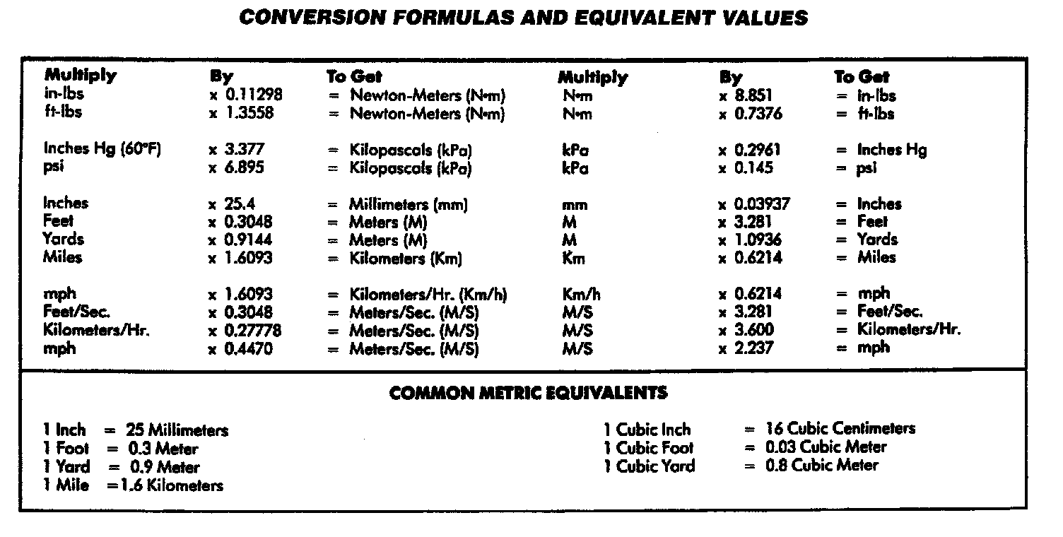 The Conversion Formula Chart will assist in converting metric units to equivalent English and SAE units, or vise versa.