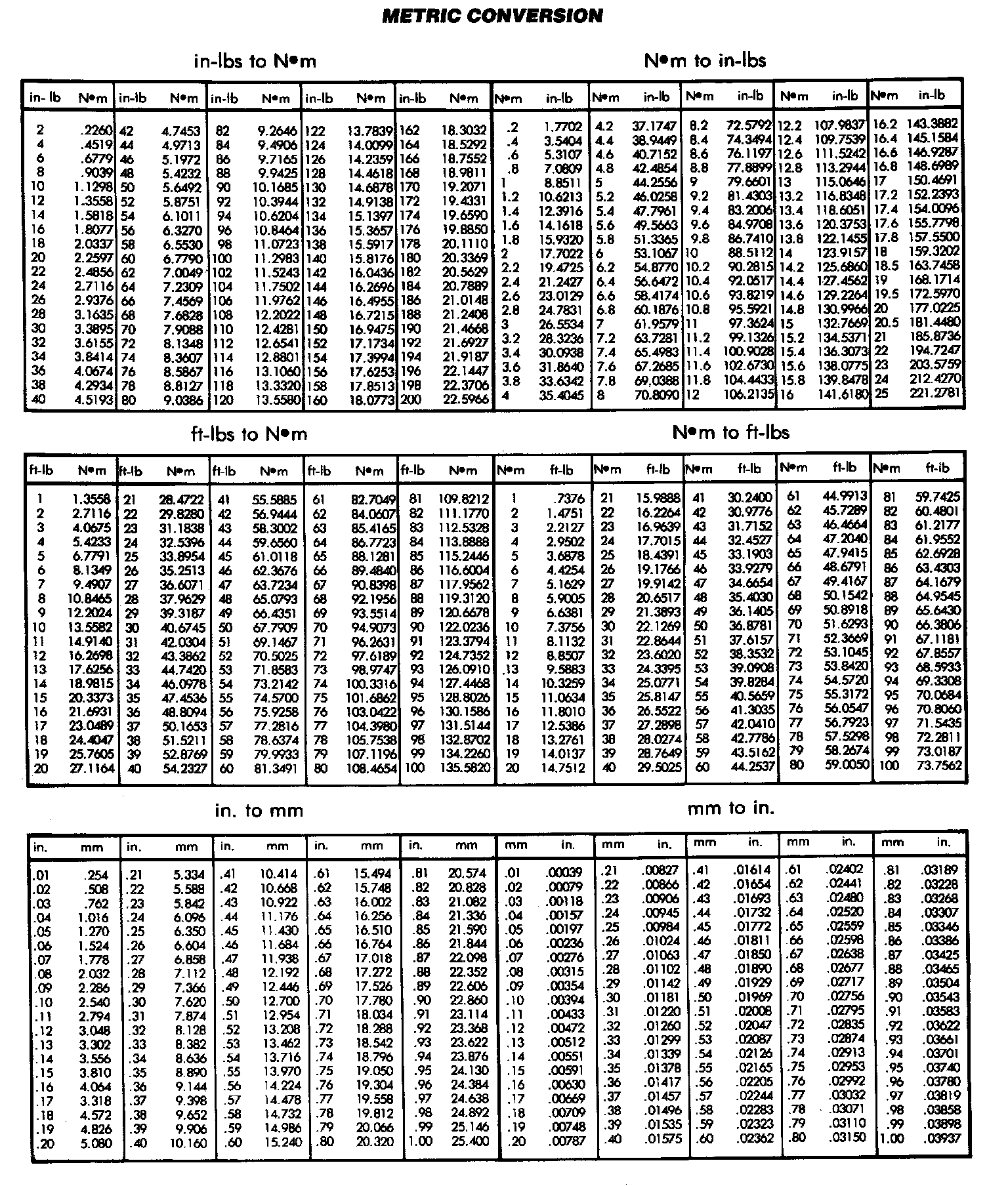 Refer to the Conversion Chart to convert torque values listed in metric Newtonmeters (Nm). Also, use the chart to convert between millimeters (mm) and inches (in.)