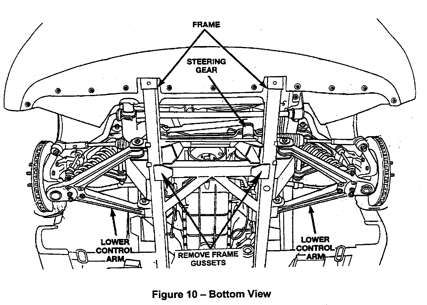 1. Using a cut off wheel or grinder, grind off the welds that hold the left and right side frame rail gussets to the frame rails (Figure 10).